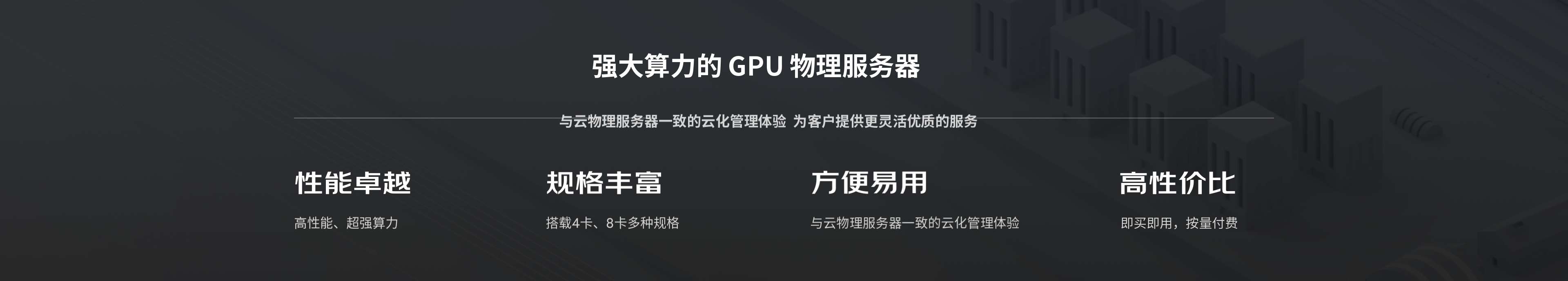 GPU 云物理服务器 (GPU Cloud Physical Server) 是VMIDC提供的搭载 GPU 算力的物理服务器,将物理服务器的高性能与 GPU 的高算力完美融合,拥有超强的并行计算及浮点计算能力。 GPU 云物理服务器支持对物理服务器全周期的云上管理,为客户提供与云物理服务器一致的云上管理体验,在人工智能、图像处理、科学计算、云游戏等业务场景中被广泛使用。